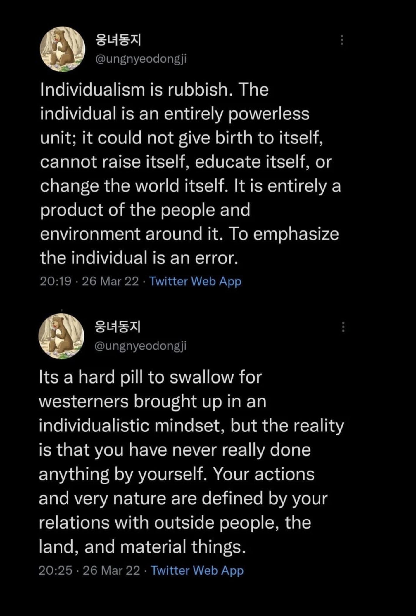 As I’ve been working on this newsletter I stumbled upon an Instagram post that sums up some good points on individualist culture. Jasmine Mariposa writes “I don’t want a future where I have to do it all myself — the culture of self sufficiency is a scam. I want my life to mimic the forest and her networks of roots and trees. I want connection and interdependence and symbiosis. A bird eats a fruit and a seed is planted with ease. A wolf makes a kill and a vulture feeds his family. Fungi decompose what remains and the soil is all the richer. Individualism is a poison in the waters.”